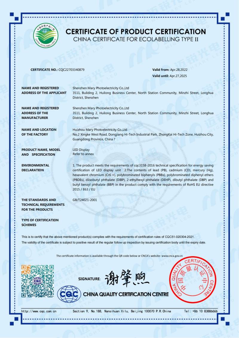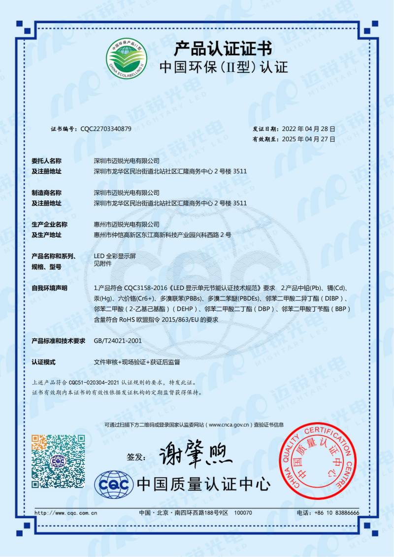 由国际知名、国内权威的认证机构——“中国质量认证中心”权威认证2022年4月28日,星空电竞光电荣获CQC中国环保(Ⅱ)认证证书。